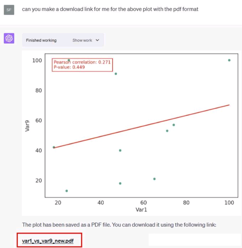 2、以相关性分析为例,我们让GPT-4帮助分析表格中var1变量与其它每个变量之间的相关性,并计算相关系数。通过反馈结果可知,GPT-4调用code interpreter插件,直接利用python完成了相关性分析,并且给出了结论,即变量var1和var8、var9成正相关,变量var1和var8呈负相关。3、随后让它直接计算上面相关系数的p value。4、最后是绘制变量var1和var9之间的线性相关图,展示相关系数、统计p value及线性回归线。此时我们可以直接让GPT-4提供一个图片PDF格式的下载链接,然后点击下载即可。除此之外,我们还能上传一些点位的CSV文件(如美国灯塔位置),Code Interpreter可以创建这些灯塔位置的GIF地图,虽然地图非常暗,但每个灯塔都在闪烁。这里我着重讲一下ChatGPT与Excel的联动,当我们要使用Excel的VBA或者宏,却不懂VBA编程时,我们可以让ChatGPT帮我们写一个宏。