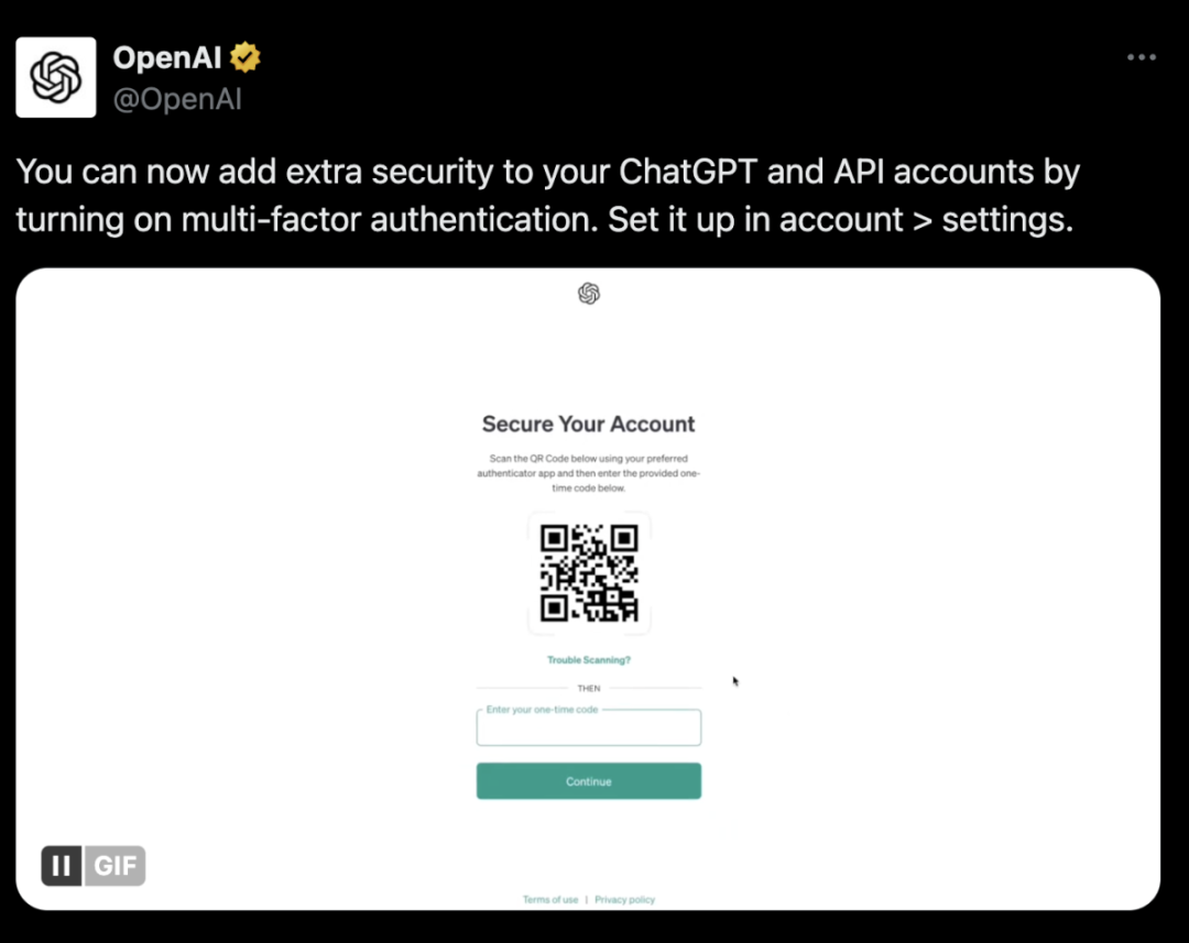 OpenAI 3月8日在社交平台X上宣布为包括ChatGPT、API Platform和Labs在内的OpenAI服务启用多重身份验证(MFA)功能,支持谷歌动态口令等身份验证器,从而降低了未经授权的用户非法登录用户账户的风险。