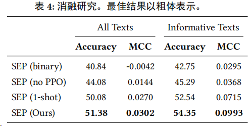 通过摘要,模型能够提取出最关键的信息,为后续的预测和解释提供了坚实的基础。作者将SEP与未经总结和经过总结的输入文本进行比较,还比较了分享最多前30篇文本和随机抽取30篇文本之间的信心量的影响,如下表所示: