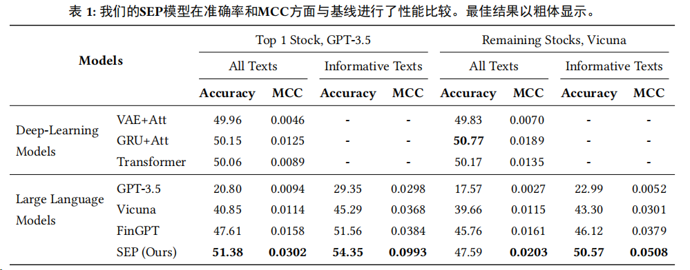 在MCC指标上,SEP模型在所有设置下都优于所有模型,展示了模型在考虑随机猜测后理解自然语言文本对股票走势影响的真实能力。