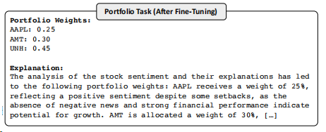 对于投资组合任务,采用与上述相同的方法来微调LLM。输入信息是每天股票篮子的所有生成解释。对于这个实验任务,仅筛选出具有正预测的股票,以减少LLM需要评估的股票数量,并防止产生负权重。然后,提示LLM根据每个给定股票的前景生成投资组合权重,如下图所示:
