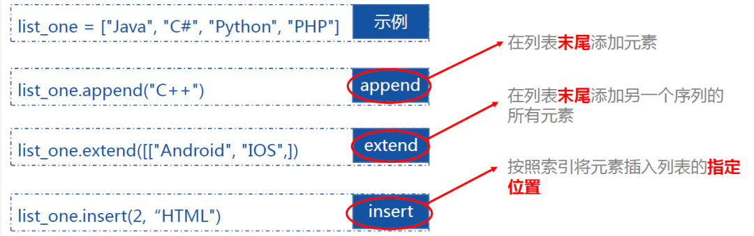 Python提供了append()、extend()和insert()这几个方法向列表末尾、指定位置添加元素。