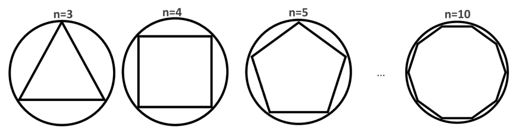 变得越来越大,多边形变得越来越像圆形。如果正多边形边数n