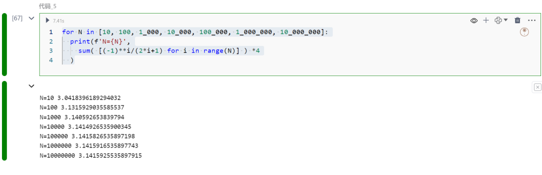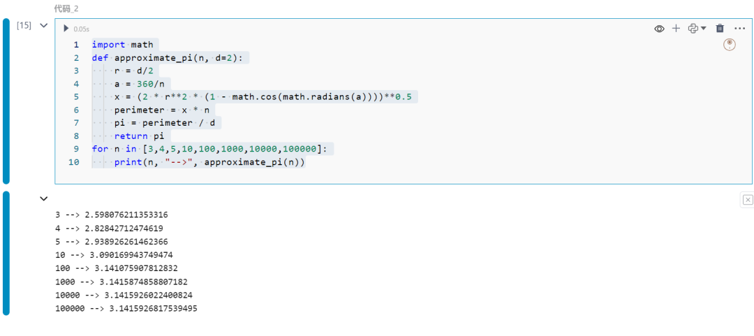 非常大,我们可以将正多边形的周长近似等于圆的周长,也就可以近似求出π。具体的推理过程忽略,直接参考下面代码: