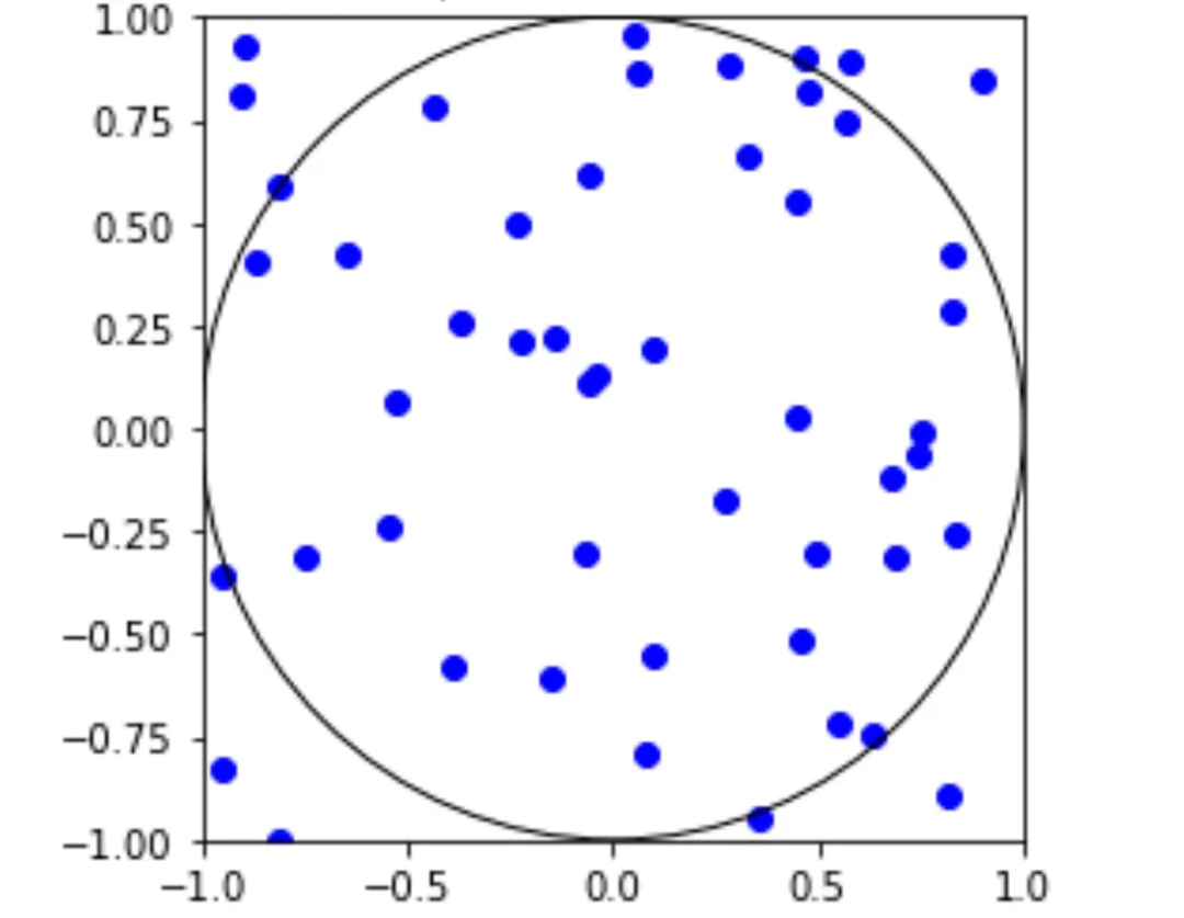 如上图假设一个半径为1.0、以原点 (0,0) 为中心的圆,以及一个从 -1.0 到 1.0 的正方形。通过随机在正方形内设置点,我们可以计算圆内的点数与总点数的比例,进而近似推导出圆的面积与正方形的面积之间的关系。随着随机坐标点的数量增加,圆内的点数与总点数的比例将逐渐趋近于 π 值。因此,我们可以利用这种统计的方法,通过计算圆内点数与总点数的比例乘以4来近似π的值。