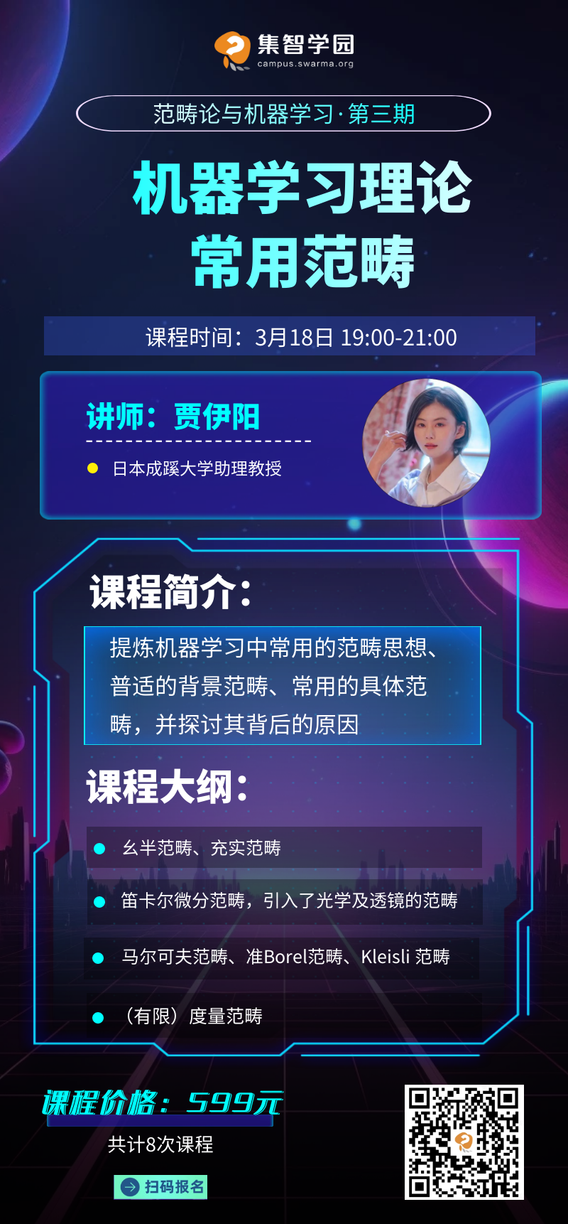 为了帮助大家对范畴论与机器学习这一交叉领域有深入的了解,理解机器学习方法背后的范畴意义,集智学园联合日本成蹊大学助理教授贾伊阳,推出了「范畴论与机器学习」系列课程,旨在面向机器学习领域并且希望深入到理论思想层面、身在数学领域想要利用人工智能解决问题的、以及希望了解一些范畴论应用前景(例如和人工智能、量子计算融合的可能)的研究者,科普机器学习前沿领域论文中出现的范畴论知识。本系列课程将以机器学习与范畴论的报告、论文和教材为课程材料,介绍其中的重要概念,以及更重要的是在这些概念背后隐藏的思想。从范畴观点切入机器学习,包括对机器学习的某些方法论建立背景的具体范畴的研究方法,以及从神经网络架构等出发研究在范畴上的某些结构,例如“层”,“纤维”,“topos”等的研究方法。这些繁琐的术语,复杂的概念如果从纯粹数学的角度出发,全然理解要耗费数年时间。本课程的主要目的是引导大家在避免过度消耗精力的同时快速了解这些概念和范畴架构在机器学习理论及应用中的意义。如果你对此主题感兴趣,欢迎加入课程与老师同学共同学习探讨。1. 课程链接:https://campus.swarma.org/course/5305