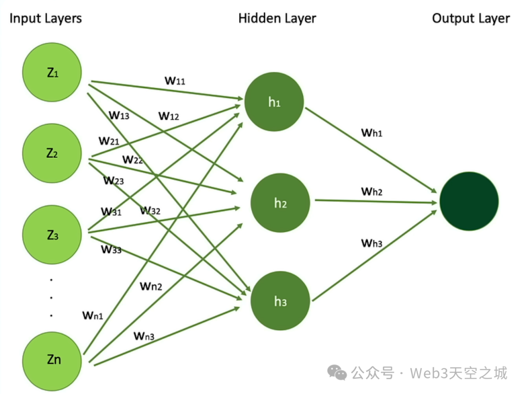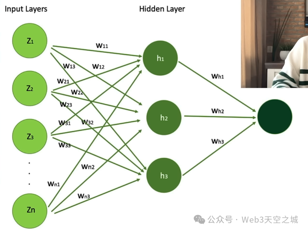 鉴于我们已经回答了前面的问题,都提到了神经网络的架构和训练过程的某些部分,这个问题很容易回答,我将在这里使用一个简单的可视化来表示简单的神经网络,该神经网络仅包含一个隐藏层只是总结我们在之前的面试问题中提到的所有内容。神经网络就是这种多层结构的模型,每一层都在一步一步地对输入数据进行变换。把它想象成一条装配线。装配线的每个阶段都会比前一个阶段增加更多的复杂性,而细节和复杂性会为模型执行预测的能力增加更多的价值。一开始,模型有这些输入层。正如您在这里所看到的,输入层由 Z1、Z2、Z3 直到 Zn 表示。在这里,您可以将这个元素、这个输入视为输入层的一部分,作为描述数据的特征。例如,我们可能想使用神经网络来估计房屋的价格。我们需要具有某些特征来估算该价格。我们需要学习才能了解如何区分不同的房屋以及这些特征如何影响房价。例如,Z1 可以是这所房子的卧室数量。Z2可以是这所房子的层数。Z3可以是房子是否有游泳池。另一个可能的特征是房子是否已经建成。这栋房子是在哪一年建造的?房子的年龄是多少?所有这些特征描述了房子的某个元素或某个特征。这将帮助我们,也将帮助模型从这个特征中学习并理解。这栋房子的准确价格是多少?