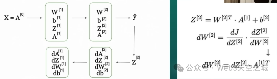 我们基本上要做的就是获取梯度,然后采用我们将使用的优化算法,例如 Adam,然后我们更新最后一层对应的权重。我们已经计算过了。然后我们继续之前的下一层。这样,我们从右边,从很深层到左边。因此,使用权重之间的乘法。通过这种方式,我们可以使用梯度,并更新权重和偏差因子,这样我们就可以调整权重,然后减少损失函数。