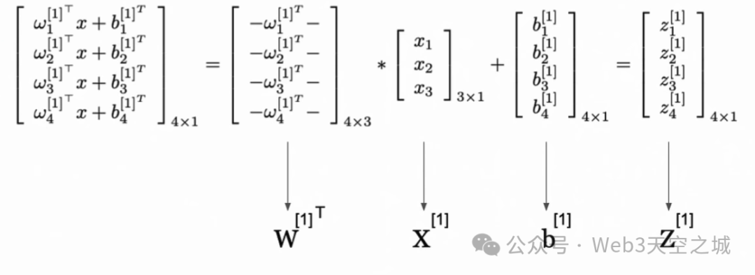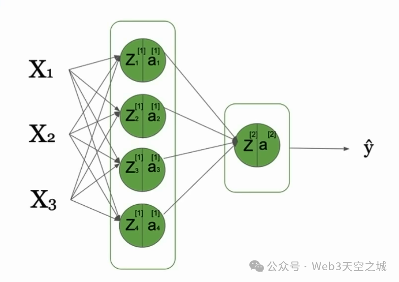 在这个简单的架构中,我们只有一个隐藏层,但也可以有更多隐藏层,这通常是传统深度神经网络的情况,因此也被称为“深度”。这些权重的作用是帮助我们理解这个输入特征应该对第一隐藏单元、第二隐藏单元和第三隐藏单元贡献多少。