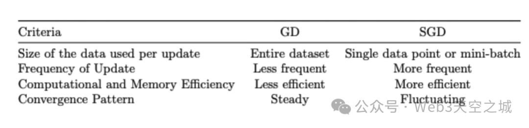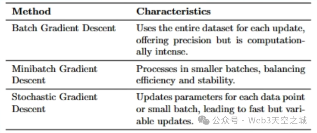 那么,梯度下降是如何执行优化的呢?在训练过程中,梯度下降在每次传递和迭代时都会使用全部的训练数据。因此,对于每次参数的更新,也就是每次更新权重因子和偏差因子时,它都会使用全部的训练数据。这意味着,在一次前向传递中,我们使用所有的训练观察结果来计算预测,然后计算损失函数,然后执行反向传播,计算损失函数相对于每个模型参数的一阶导数,然后使用这些导数来更新参数。