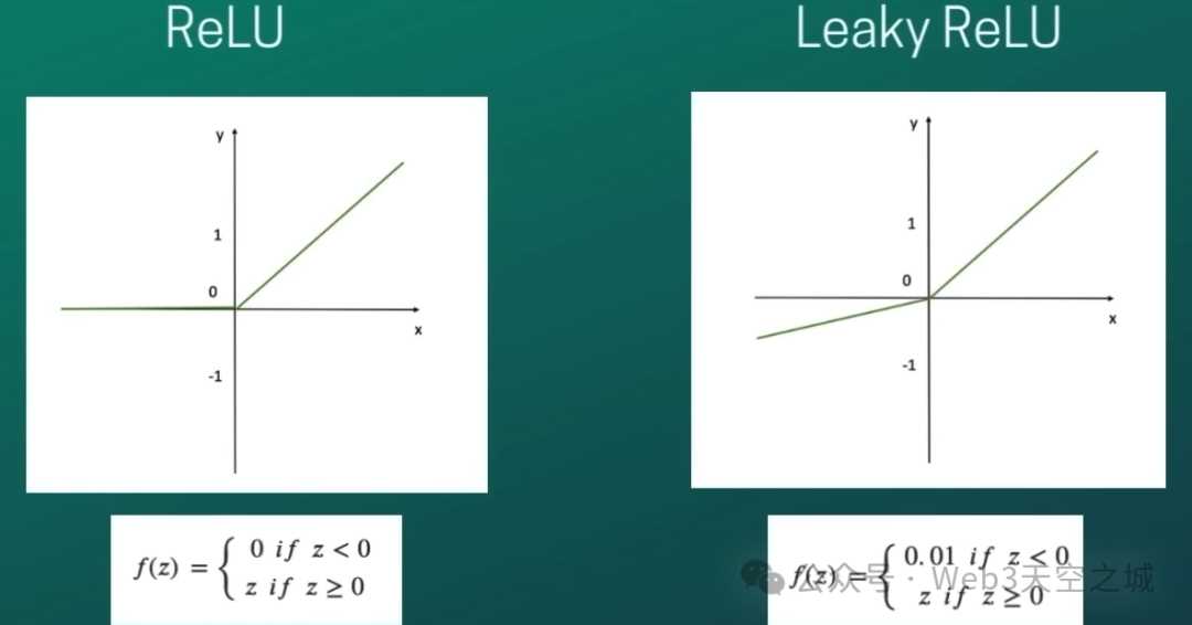 当我们查看整流器线性单元时,实际上是激活函数,您可以看到它看起来像这样。所以它适用于z时的所有情况,所以激活,如果z分数小于0,那么它是负数,那么相应的激活将为0。所以基本上,这个激活函数不会激活任何负神经元。而对于z分数为正的情况,则相应的激活将完全等于z分数。因此,名称为线性。因此,如果您查看y等于x的线,并且可视化该线,您可以看到正数部分,因此对于x从0到无穷大为正数的部分,您可以看到y等于x线与我们这里的完全一样。这就是“线性”这个词的由来。它类似于线性函数的表示,但只适用于正数。对于正数,我们将得到z分数,并根据其确切数量进行激活。然而,如果z分数为负或神经元为负,则相应的激活不会发生,我们也不会激活这些负值。在所有这些情况下,激活函数会将激活值设置为0。因此,当我们确实想要输出、我们确实想要考虑这些负值、并且我们想要考虑这些负值并基于它们进行预测时,这可能会出现问题。在这些情况下,我们需要调整这个ReLU,这样我们就可以更好地使用我们所说的Leaky ReLU。