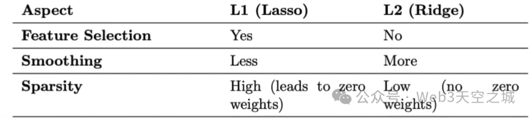 你可能从这些传统的机器学习模型中知道L1和L2正则化做什么。L2正则化也称为岭回归,L1正则化也称为套索回归。L1正则化的作用是添加作为归一化、正则化或惩罚因子,该因子基于惩罚参数lambda乘以基于权重绝对值的项。这与L2正则化不同,L2正则化是岭正则化,这种正则化增加了我们的损失函数,基于lambda的正则化项,即惩罚参数乘以权重的平方。这样您就可以看到两者有何不同,一个基于我们所说的L1范数,另一个基于我们所说的L2范数,因此称为L1和L2正则化。富正则化中,稀疏性较低,因为它不会将权重设置为零,而是将它们缩小到零,但永远不会完全等于零。