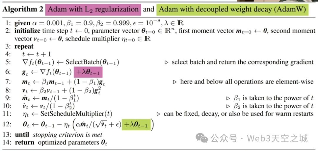 这里当然指的是我们刚刚讨论的Adam优化算法,Adam W很简单,它是传统Adam优化器的调整版本。Adam W是一种自适应优化算法,它被用于优化神经网络的训练并找到损失函数的极小点。这种算法通过不断采用学习率并更新模型参数来实现优化。Adam W与Adam的最大区别在于他们执行正则化的方式。
