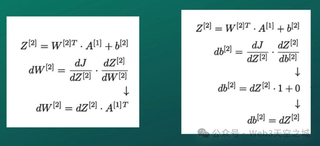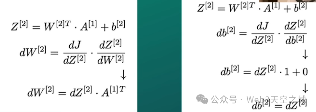在前向传播的过程中,我们执行所有转换,激活神经元,然后得到预测的响应变量,即y帽。一旦我们得到了y帽,我们也会缓存我们的最终结果,即z分数值。z分数等于输入x乘以权重参数,再加上偏置参数。有了这个之后,我们可以应用各种微分规则,特别是链式法则,同时我们也可以利用求和的微分规则和应用于常数的微分规则,以更新损失函数相对于激活的梯度,即dA。