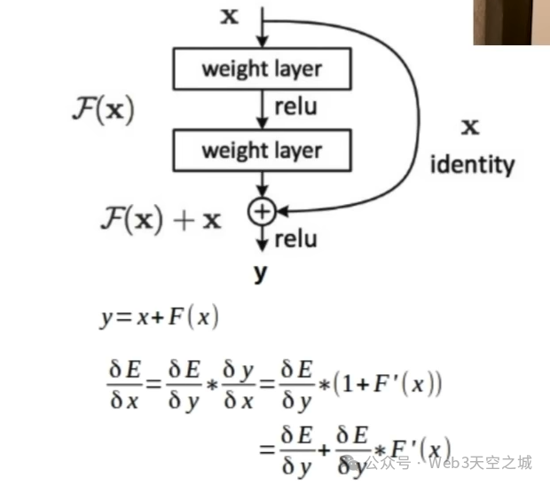 现在,它被称为快捷方式的原因是,在计算梯度时,梯度将经历这个变换,我们需要计算损失函数的偏导数相对于权重。为此,我们首先需要计算损失函数相对于Z分数的偏导数,然后我们需要计算Z分数相对于权重的偏导数,然后使用两者并使用链式法则计算损失函数相对于权重的偏导数。现在,该梯度的整个变换将导致在许多情况下梯度非常接近于零并消失,这就是臭名昭著的梯度消失问题。为了避免这种情况,我们对残差连接所做的就是我们也有这个快捷方式,所以你可以看到我们不仅执行这种不同的变换,所以我们有x,然后我们有权重层,然后我们有修正的线性单元激活,然后我们有权重层,然后我们得到的输出是fx。最重要的是,我们还添加了这个x,因此初始输入位于该输出的顶部。这就是我们所说的剩余连接。为什么你可以看到我们有这种捷径的想法,因此梯度不仅可以通过这些变换流入网络,还可以直接流入网络。朝向梯度的理解需要数学推导。如果我们考虑输出 y 等于 x 加 fx,其中 x 是我们在输出 fx 顶部添加的输入,你会发现如果我们对这个函数求偏导数,对于 x,我们需要做的是应用链式法则。因此,我们需要先对 e 对 y 求偏导数,然后将其与 y 对 x 的偏导数相乘。这等于 e 对 y 的偏导数,与我们这里的完全相同,但然后将其乘以 1 加 fx,或者说 f 对 x 的一阶导数。