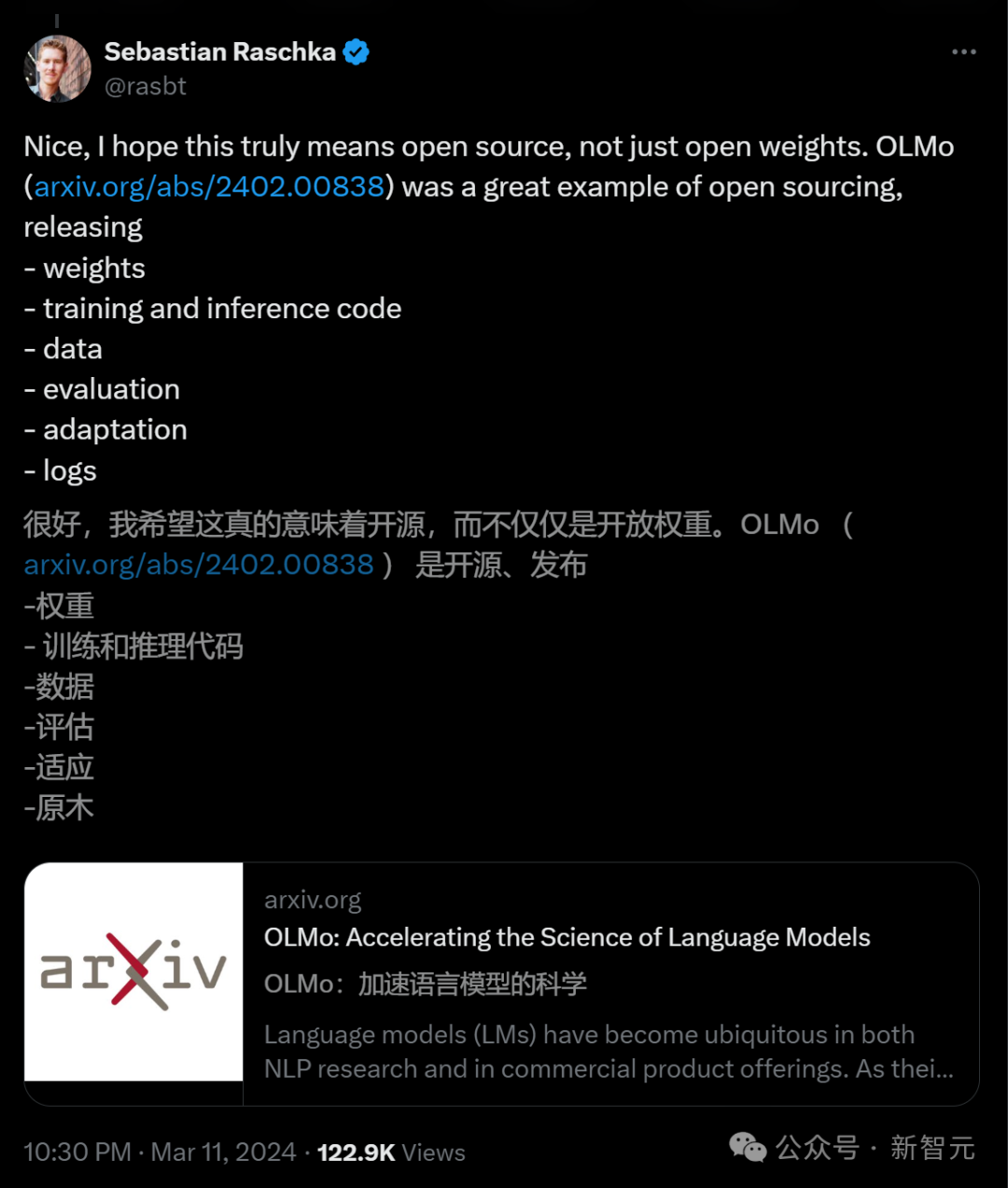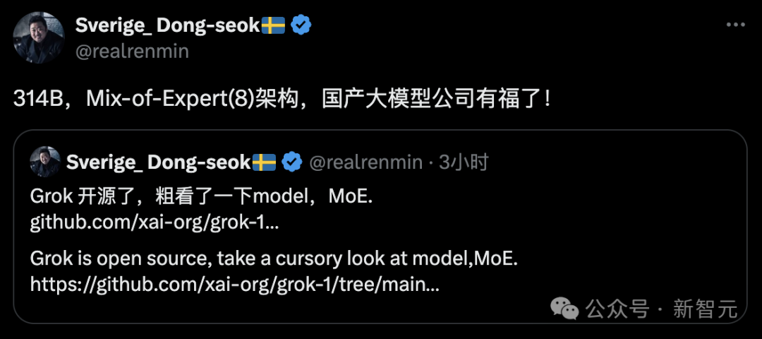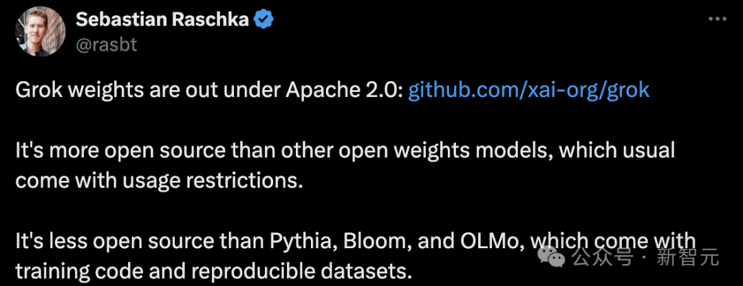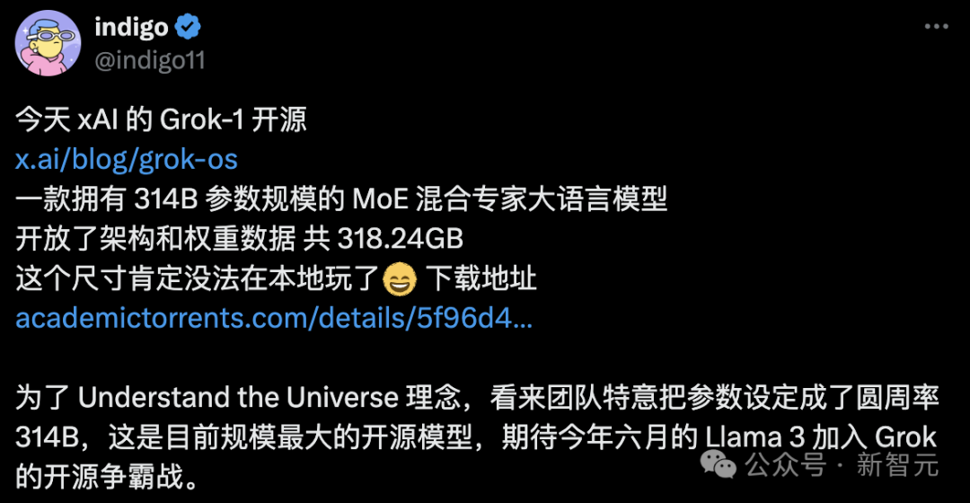 作为市场领导者的OpenAI,是没有理由开源ChatGPT背后模型代码的。现在,通过发布Grok的代码,马斯克将自己牢牢扎根在后者的阵营中。这一决定,或许能让他的xAI超越Meta和Mistral AI。Llama的开源给Meta带来了很多好处,几乎让小扎从元宇宙的泥潭爬了出来。而仅仅只是一个小型初创公司的Mistral AI,也因为自己的开源策略而声名鹊起,被业界公认为「欧洲的OpenAI」。开源版本可能会鼓励开发者和潜在客户更快地采纳自己的模型,实际上起到了市场推广的作用。开发者社区对Grok开源版本的反馈和改进也可能有助于xAI加速开发新版本,这些新版本xAI可以选择开放源代码或保留专有权。比如像Mistral一样,承诺继续发布开源版本,同时为付费客户保留最先进的模型。马斯克一直是开源技术的支持者,连Tesla也已经开放了汽车某些部分的源代码,而他的社交媒体平台X公开了一些用于内容排名的算法。「还有工作要做,但这个平台已经是迄今为止最透明、最注重真相、不是高门槛的平台,」马斯克今天在回应对开源X推荐算法的评论时,这样说道。尽管OpenAI目前在AI领域仍遥遥领先,但开源和闭源的战争还远远没有结束。AI模型是否应该开源?某些人认为,必须防止这种强大技术免受闯入者的侵害,而另一些人则坚持认为,开源的利绝对大于弊。作为市场领导者的OpenAI,是没有理由开源ChatGPT背后模型代码的。现在,通过发布Grok的代码,马斯克将自己牢牢扎根在后者的阵营中。这一决定,或许能让他的xAI最终超越Meta和Mistral AI。https://x.ai/blog/grok-oshttps://twitter.com/itsandrewgao/status/1769447551374156097https://www.wired.com/story/elon-musk-no-choice-open-chatbot-grok/