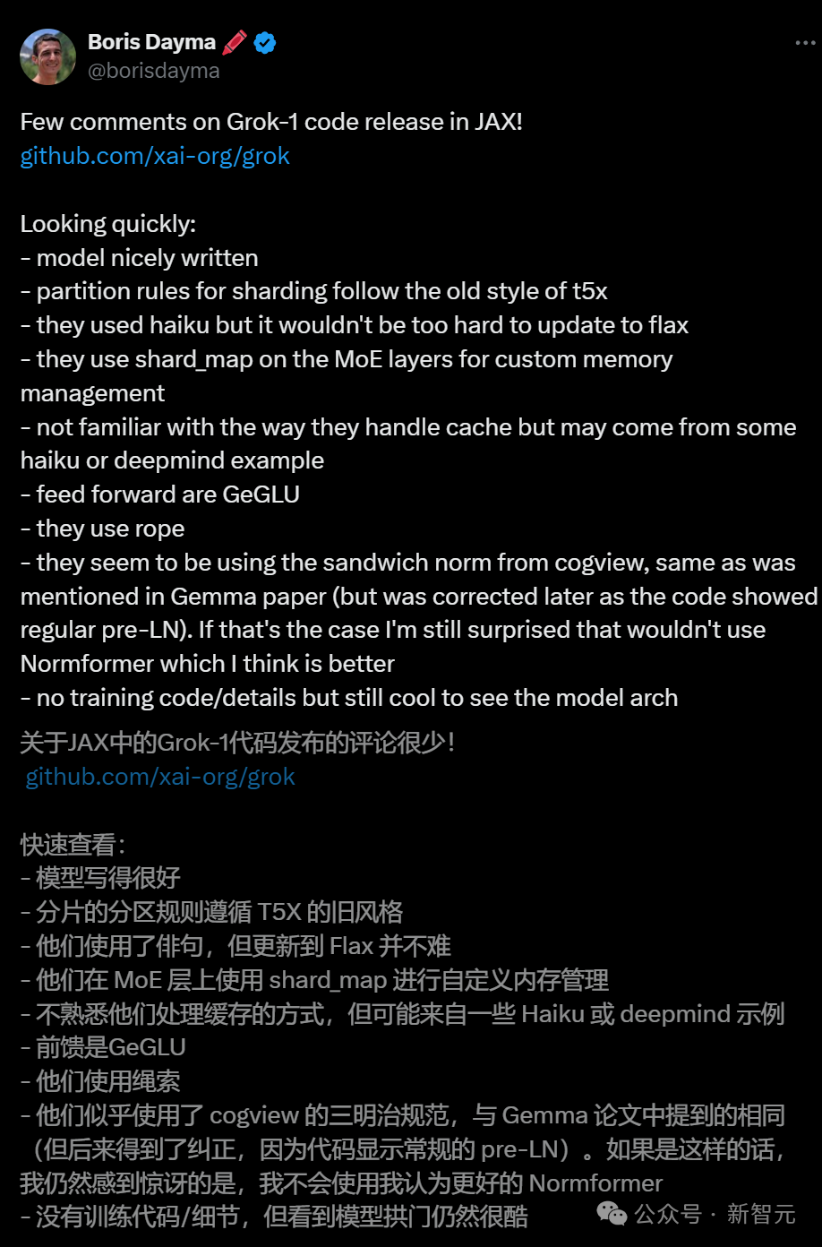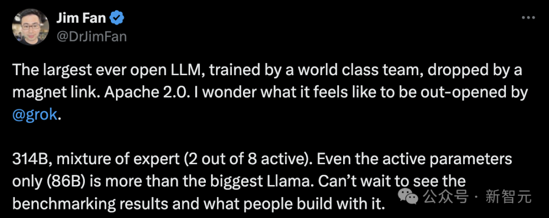英伟达高级科学家Jim Fan表示,「有史以来最大的开源大模型,由世界级团队训练,通过磁力链Apache 2.0发布。314B参数,混合专家模型(8个专家2个是活跃的)。就连活跃参数规模(86B)都超过了最大的Llama模型。迫不及待地想看到基准测试结果,以及人们能用它构建出什么样的应用」。AI研究人员Sebastian Raschka表示,与其他通常有使用限制的开源模重模型相比,Grok更为开源。不过它的开源程度低于Pythia、Bloom和Olmo,后者提供了训练代码和可重现的数据集。Craiyon创始人Boris Dayma,详细分析了Grok-1的代码。网友indigo表示,为了「理解宇宙」的理念,看来xAI团队特意把参数设定成了「圆周率 314B」,这是目前规模最大的开源模型,期待今年6月的Llama 3加入Grok的开源争霸战。第一代Grok已超越Llama-2-70B