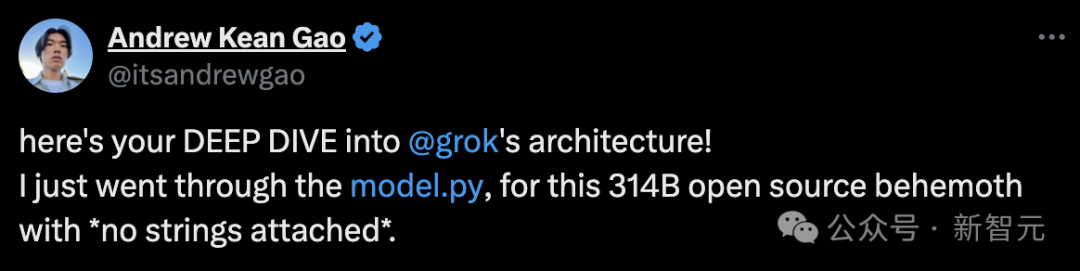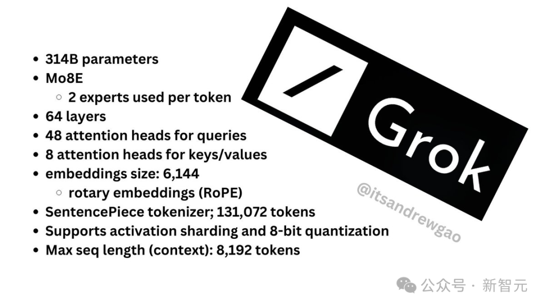 斯坦福研究者Andrew Kean Gao浏览了model.py介绍了更多Grok的架构信息,3140亿参数没有更多附加条款。8个混合专家(2个活跃专家),860B活跃参数。它使用旋转嵌入,而不是固定位置嵌入。- tokenizer词汇量:131,072(于GPT-4类似)相当于2^17