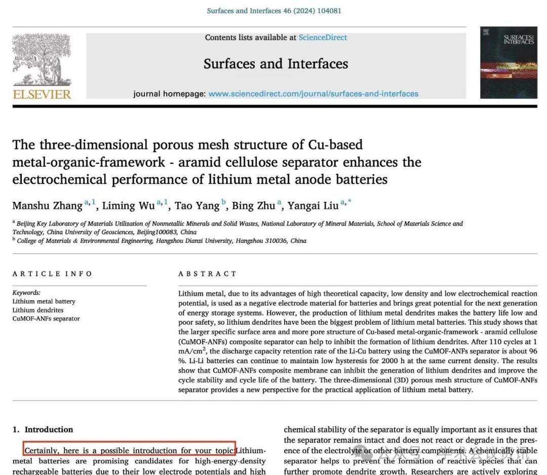 论文介绍部分,开头疑似使用了ChatGPT的常用提示语。目前,该篇文章还可以正常阅读。
