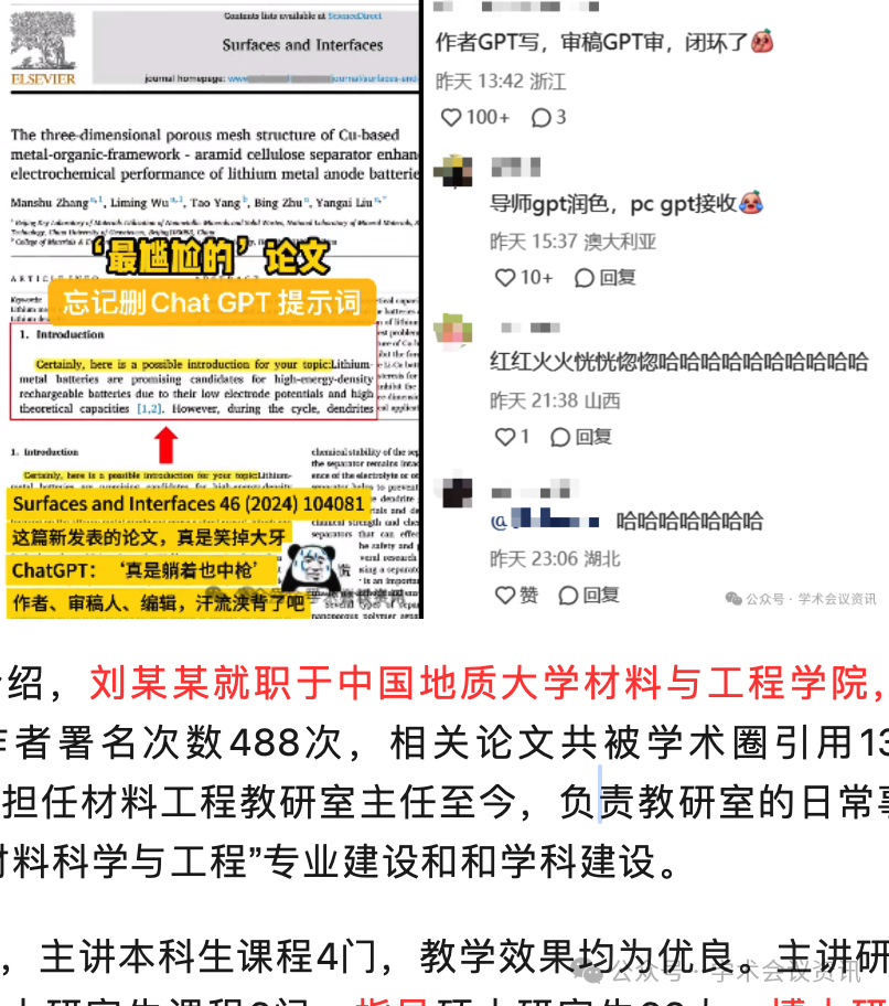 211大学教授、博导SCI期刊发论文,被质疑忘删掉ChatGPT提示词…