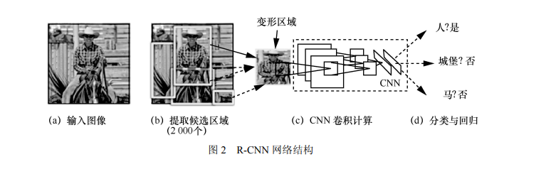 R-CNN 图像目标检测模型是 Girshick 等[6]于 2013 年提出的,它是候选区域和卷积神经网络这 一框架的开山之作,也是第一个可以真正应用于 工业级图像目标检测的解决方案,为基于 CNN 图 像目标检测的发展奠定了基础。网络结构如图 2 所示。R-CNN 首先使用选择性搜索方法从输入的 图像中提取出 2 000 个候选区域,使用剪裁[9]和变 形[19]的方法将候选区域的尺寸固定为 277×277 以 适应全连接层的输入,通过 CNN 前向传播对每个 候选区域进行特征计算;然后将每个候选区域的 特征向量送入特定线性分类器中进行分类和预测 概率值;最后使用非极大值抑制(non-maximum suppression,NMS)[20]算法消除多余的目标框, 找到目标的最佳预测位置。