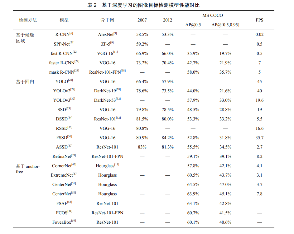 本文对现有经典图像目标检测模型的创新点 及优缺点做出对比,见表 1。无论是候选区域法、 回归法还是 anchor-free 法,提出模型的主要目的 都是为了能够高精度、高速率地识别并检测出目 标。由表 1 可以看出,基于候选区域法模型的提 出开启了用 CNN 提取特征的大门使图像目标检 测进入深度学习时代,回归法则解决了候选区域 法的速度瓶颈问题,实现了端对端的图像目标检 测。而基于 anchor-free 的算法消除了候选区域法 和回归法中候选框的设计,生成高质量的目标框 并在未来形成了一个有前途的方向。对本文中提到的图像目标检测模型在公共数 据集上的检测结果做出对比,见表 2。“—”表示 此数据集没有该模型的测试结果,2007 表示数据 集 VOC 2007,2012 表示数据集 VOC 2012;AP@0.5 表示该模型在 MS COCO 数据集上是取 阈值为 0.5 计算精度的,AP@[0.5,0.95]表示该模 型在 MSCOCO 数据集上是取 10 个阈值(间隔 0.05)计算精度的,即 mAP,表 2 中所有的数据 集精确率检测结果均以百分比为单位。FPS 表示 该模型每秒处理图片的数量。