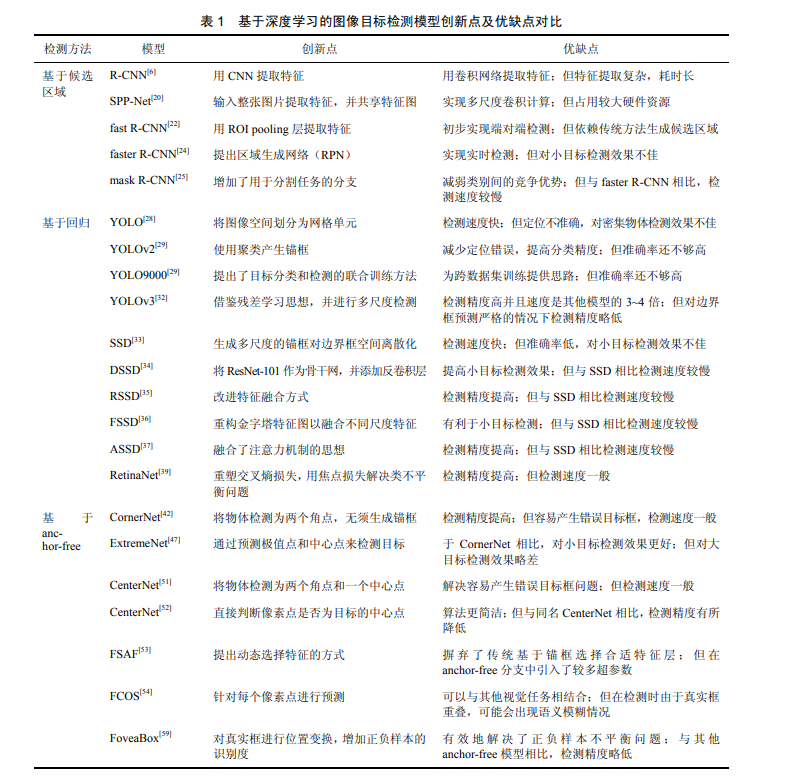 本节将介绍近几年提出的基于候选区域、回 归和 anchor-free 的图像目标检测模型,总结各模 型相比之前模型的改进策略以及自身的创新点和 不足,并在 PASCAL VOC2007[17] 、 PASCAL VOC2012[17]和 MS COCO[18]等常用公共数据集上 做出比较。