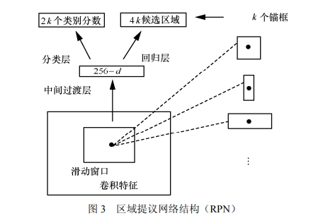 由于 fast R-CNN 无法满足实时检测的需求, Ren 等[24]提出了改进模型 faster R-CNN。该网络 的最大创新就是提出了区域提议网络(region proposal network,RPN),即在基础卷积网络提 取输入图像特征的基础上用 RPN 代替 fast R-CNN 中的选择性搜索方法进行候选区域的提取。RPN 是一个全卷积网络,网络结构如图 3 所示,该网 络可以同时在每个位置上预测出目标边界和目标 概率并产生高质量候选区域,然后通过 ROI pooling将卷积特征变成固定大小的ROI特征输入 全连接层进行目标分类和位置回归。RPN 和 fast R-CNN通过四步交替训练法使两个网络共享卷积 特征合并为单一网络,解决了区域计算的瓶颈问 题,在实现真正端对端训练模式的基础上满足了 实时应用的需求[23]。
