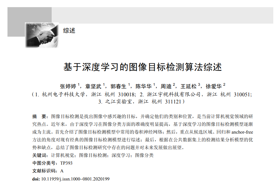 本文首先介绍了图像目标检测模型中常用的 卷积神经网络;然后,重点从候选区域、回归和 anchor-free 方法等角度对现有的图像目标检测模 型进行综述;最后,根据在公共数据集上的检 测结果分析模型的优势和缺点,总结了现有图 像目标检测研究中存在的问题并对未来发展做 出展望。