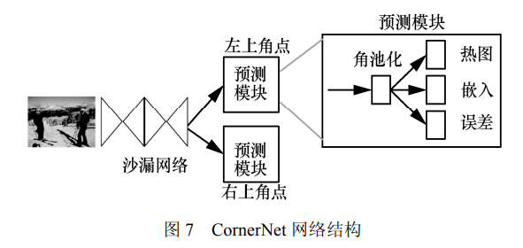 2018 年 Law[42]受到 Newell 等在姿态估计[43-46] 中的关联嵌入的启发提出了 CornerNet,这是一种 新型的图像目标检测方法。CornerNet 将一个目标 检测为一对关键点,即目标边界框的左上角点和 右下角点,是第一个将图像目标检测任务表述为 利用嵌入角点进行分组和检测任务的模型,开启 了基于关键点的目标检测方法的大门。CornerNet 首先使用沙漏网络[15]作为其骨干网络输出最后一 层卷积特征,骨干网后接两个分支模块,分别进 行左上角点预测和右下角点预测,每个分支模块 包含一个 Corner pooling(角池化)和 3 个输出, 网络结构如图 7 所示。heatmaps(热图)输出的 是预测角点的位置信息,当图像中出现多个目标时,embeddings(嵌入)根据左上角点和右下角 点嵌入向量之间的距离对属于同一目标的一对角 点进行分组;offsets(误差)是输出从图像到特征 图的量化误差,用来对预测框进行微调。