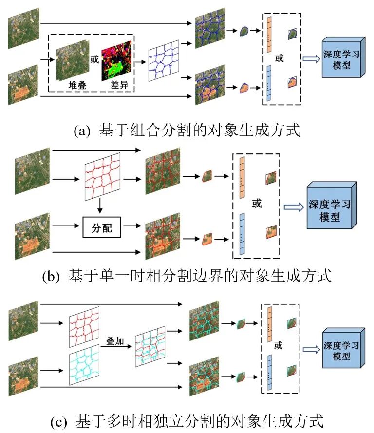 基于对象的方法:对象是指对应于一定实体、内部相对均匀的像素组合,其能有效结合光谱和空间纹理特征,提供更精确的地物信息。基于对象的比较分析利用了对观测条件不敏感的地物空间特征 (形状、空间关系等),可有效减弱随机噪声以及季节变化对变化检测结果的影响,在高分辨率遥感图像变化检测中具有一定优势,并且被用于检测建筑等地理实体变化。在基于对象的方法中,对象生成是最重要的步骤之一,直接影响网络的检测性能,其主要有以下三种生成方式:基于组合分割、基于单一时相分割、基于多时相独立分割 (图5)。