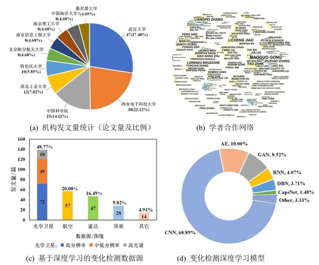 文献结构:发文量年际变化如图1所示, 2016年以来,国际上有关深度学习的遥感变化检测研究呈现持续快速增长趋势,国内研究与国际研究趋势基本保持一致;发文量最多的10份期刊占比86.05% ,如表1所示;从机构发文量来看 (图2 (a)),中国对遥感变化检测研究重视程度更高,成果最为突出;学者之间的合作关系呈现“整体分散、局部集中”的特点,中国学者占主导,公茂果、焦李成、张良培团队等产出较多 (图2 (b))。