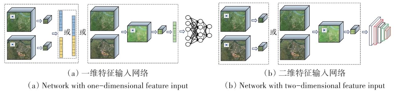 基于像素的方法:从单个像素或单个像素的邻域 (移动窗口) 提取深度特征 (图4),逐像素判断变化情况,是深度学习应用于变化检测最早的方法。基于像素的方法简单直观,但是逐像素处理效率较低,并且由于假设每个像素独立,检测结果易产生椒盐噪声。通过移动窗口提取的局部特征可缓解噪声影响,同时降低对几何配准精度的要求,然而移动窗口过大可能导致检测的变化边界模糊。在应用于中低分辨率遥感图像时结果较为准确,并且适用于大面积场景。对于高分辨率遥感图像则难以避免不同观测角度、阴影等造成的虚假变化的影响。