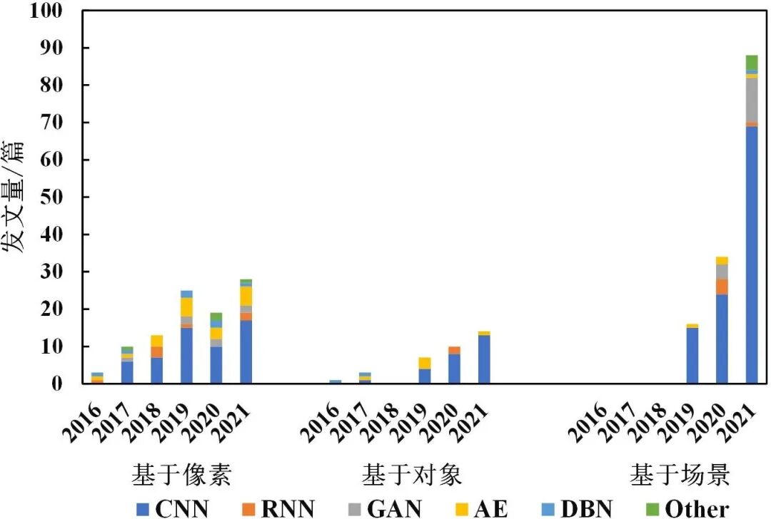 基于深度学习的遥感变化检测方法在像素、对象和场景不同粒度表征地物特征差异,然后通过后续网络处理进一步提取深度特征并判别其变化。图3统计了基于像素、对象和场景三种情况下的发文量以及网络模型的使用情况。
