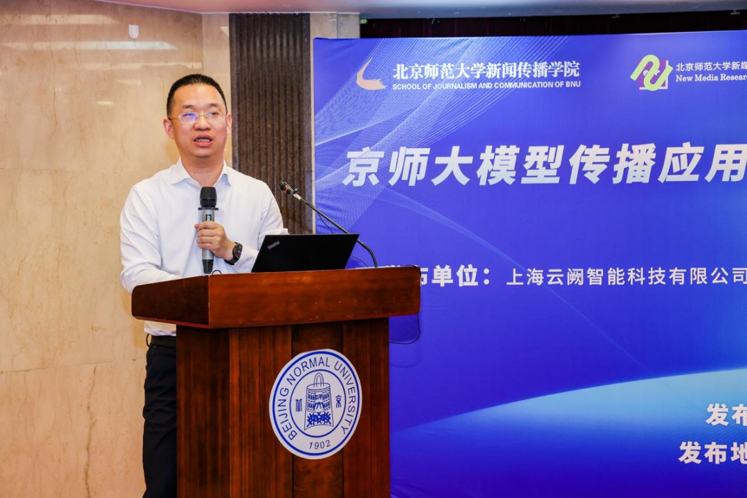 云阙智能创始人、董事长毛雷雷首先向北京师范大学新闻传播学院对本次发布的支持表示感谢。随后,他介绍了云阙智能在AIGC方面开展的工作,在汽车、餐饮、消费电子、金融、房产等多个行业中实现AIGC商业化的成功应用与用户认可。未来,云阙智能将探索与更多高校、企业、产业链伙伴、AIGC个体等一道持续推动AIGC生产力变革,并借由AIGC技术实现营销的降本增效和人才转型,深度赋能多类产业体系的建设,助力打造新质生产力,致力于成为产业AIGC化加速器。