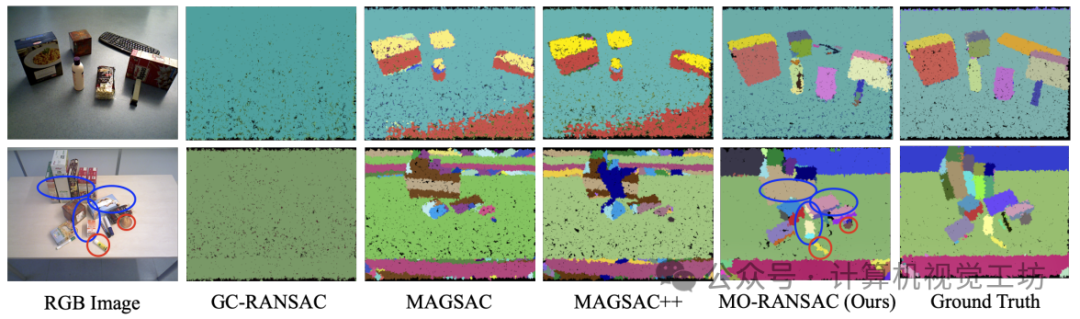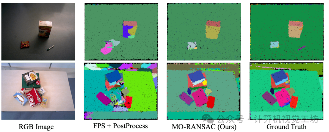 - 定量结果:在OCID和OSD数据集上,多目标RANSAC在大部分指标上均优于其他方法。
