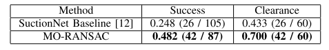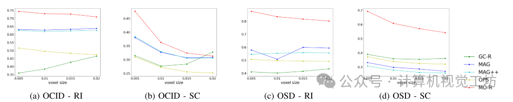 MO-RANSAC的性能变化基于体素大小(m)来进行评估表2:吸力抓取精度与其他平面聚类方法的比较