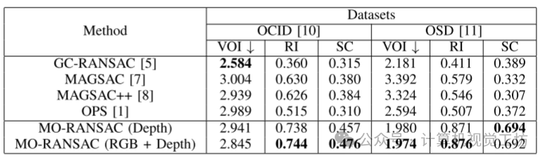 MO-RANSAC的消融实验表1:在OCID和OSD数据集上的分割性能比较