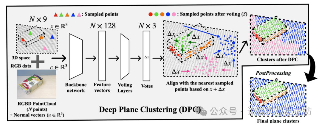 概述:该方法主要分为深度平面聚类(DPC)模块和后处理模块。