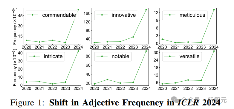 在下图中,可以看到ICLR 2024同行评审中,某些形容词的频率发生了显著变化,例如「值得称赞的」、「细致的」和「复杂的」,它们在出现在句子中的概率分别增加了9.8倍、34.7倍和11.2倍。而这些词大概率是由人工智能生成的。