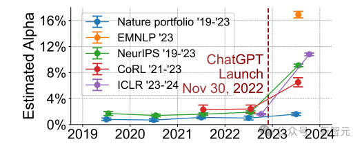 斯坦福团队研究的AI会议包括ICLR 2024、NeurIPS 2023、CoRL 2023和EMNLP 2023,他们的研究发生在ChatGPT发布之后,实验观察估计LLM可能会显著修改或生成的大语料库中的文本比例。