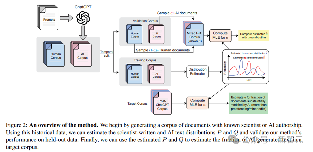 研究人员首先生成一个具有已知科学家或AI作者身份的文档语料库。利用这些历史数据,我们可以估算科学家撰写的文本和AI文本的分布P和Q,并验证我们方法在留存数据上的性能。最后,使用估算的P和Q来估算目标语料库中 AI 生成文本的比例。