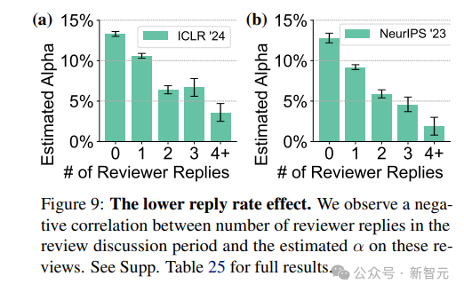 3. 回复率降低效应:审稿讨论期间,审稿人回复数量越多,评审更不会用GPT