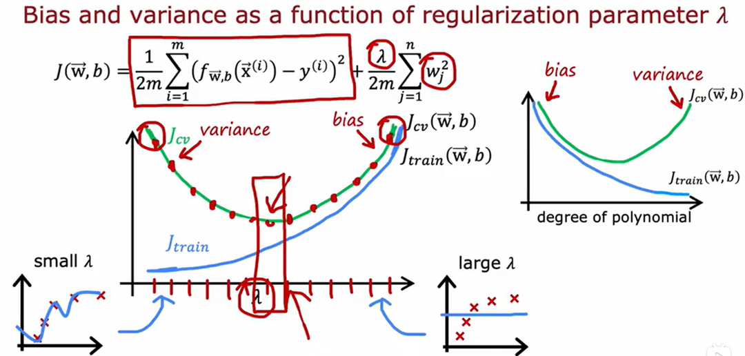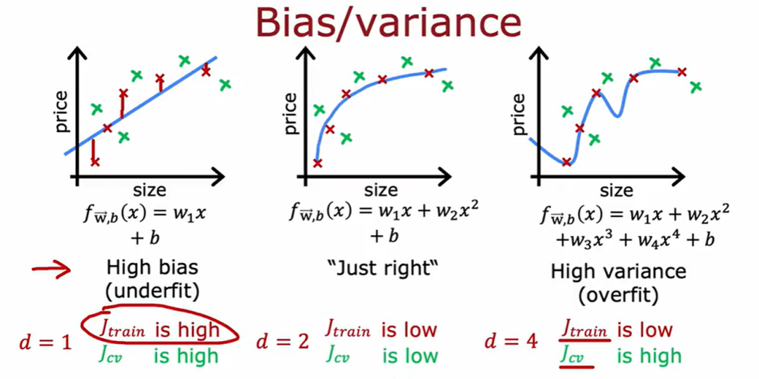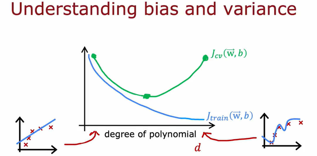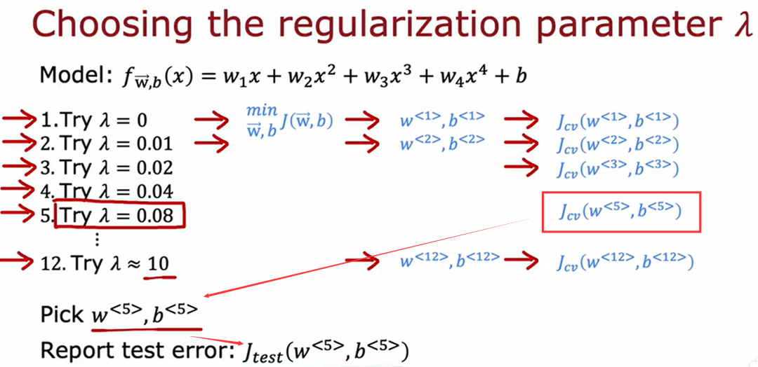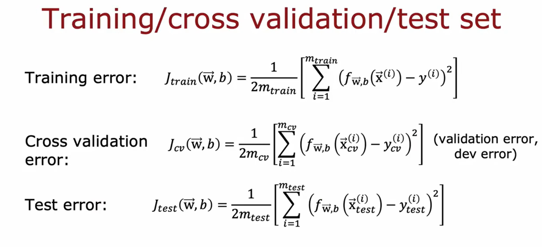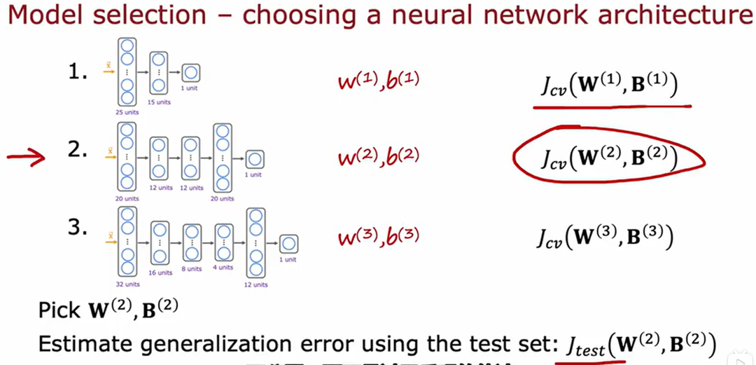 注:图中有3个神经网络模型,分别用每一个模型在训练集上进行训练,会得到3组参数,将训练好的模型在验证集上进行验证,查看每一个模型的损失函数Jcv(w,b),找到误差最小的模型,假设第二个模型在验证集上的损失最小,那么最后再把第二个模型放到测试集上进行测试。