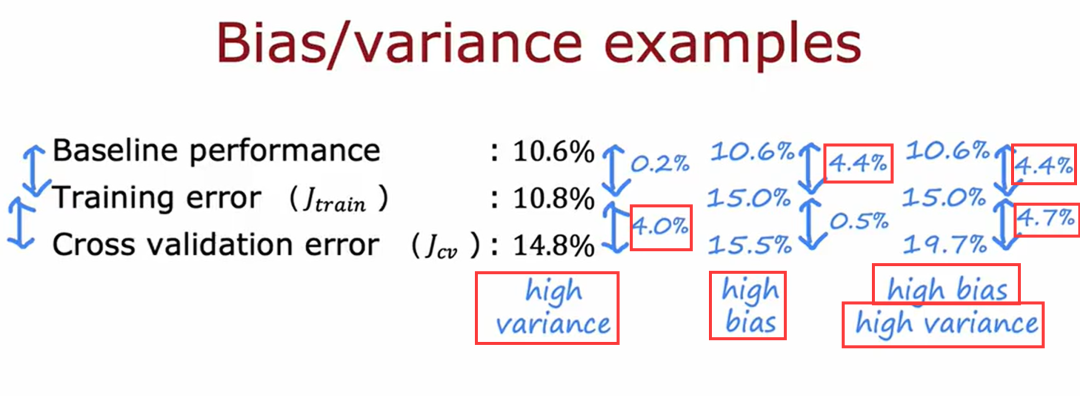 模型在训练集上的错误率低,但是在验证集上偏高,说明模型存在高方差,高方差是过拟合的表现。模型在训练集和验证集上的错误率均较高,但是错误率接近,说明模型存在高偏差,高偏差是欠拟合的表现。模型在训练集的错误率高,在验证集的错误率更高,说明模型同时具有高偏差和高方差。同时具有高方差和高偏差的情况说明模型既没有很好地拟合训练数据,也没有很好地泛化到新数据。