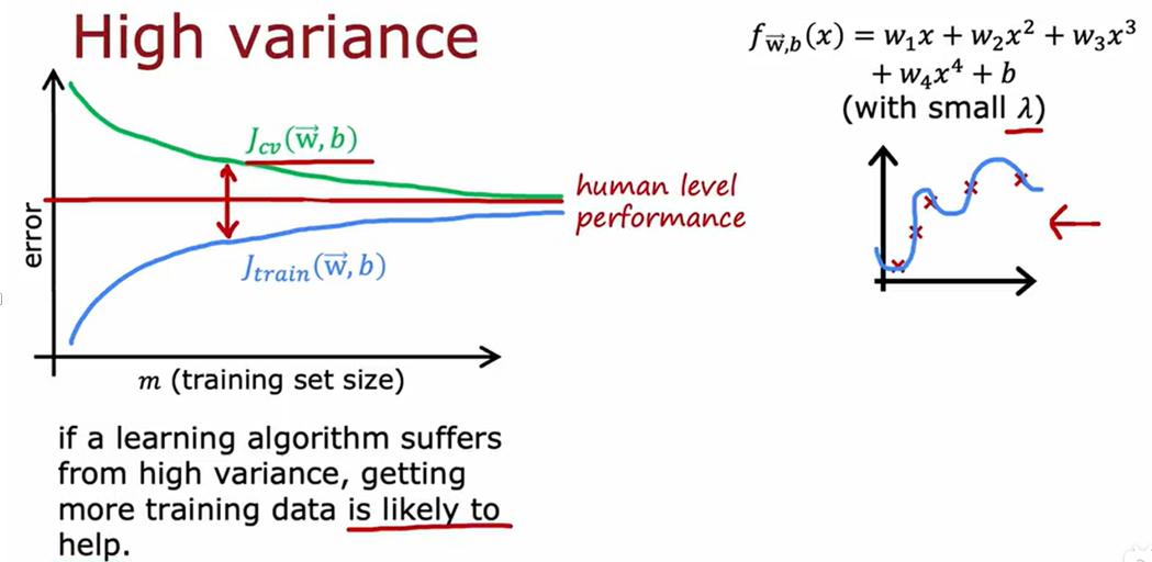 注:如果模型具有高方差,那么通过获取更多的训练数据,可能是有帮助的。