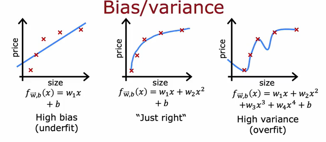 注:训练出来的模型如果过于简单,在训练集和验证集上都会存在高偏差,如果模型过于复杂,会使模型出现过拟合,在训练集上表现良好,但是在验证集上误差较大。
