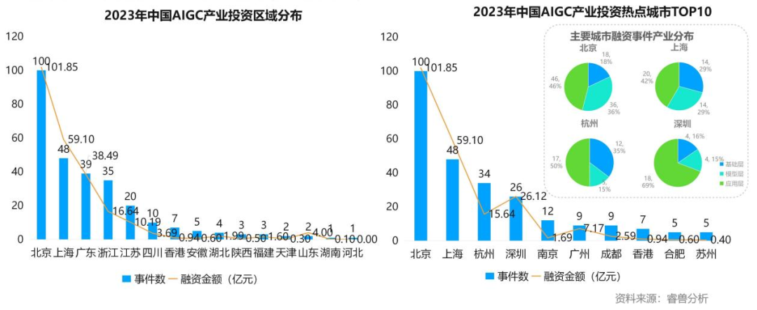北京模型层共发生36起融资事件(其中通用大模型18起),占北京总体的36%,高于均值23.56%,说明凭借强大的科创能力和位列第一的算力规模指数,北京吸收大量AI模型优质企业。上海GPU算力基础设施创企数量多,产业底蕴深厚,基础层融资占比近三成。杭深具备直播电商、文化娱乐等互联网产业新势能,AIGC应用潜力巨大,体现在应用层融资事件占比分别为50%、69.23%。