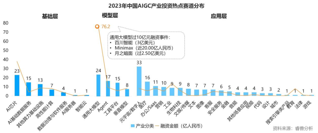 据睿兽分析数据,2023年,国内AIGC产业在通用大模型、元宇宙/数字人、AI芯片三个细分赛道最为活跃,通用大模型也是融资金额最多的领域,高达76.20亿人民币。由于Q4多模态大模型、边缘算力引领新风口,专注视觉处理及多传感器融合+人工智能芯片及产品设计的银牛微电子单笔融资过5亿元,仅次于Q3人工智能领域云端算力平台燧原科技的20亿元天价融资。
