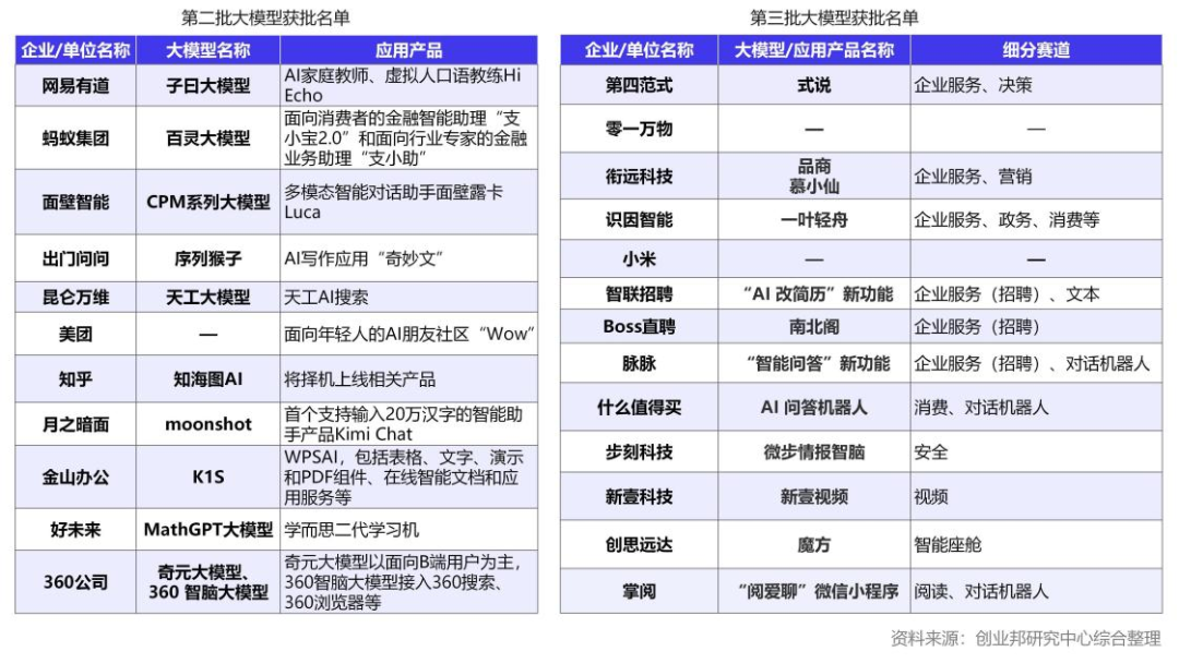 根据2023年7月颁布、8月实施的《生成式人工智能服务管理暂行办法》,采取分层分批培育大模型创新。2023年8月,阿里巴巴、腾讯、智谱AI、百川智能等多家大模型企业首批 “上岗证”,互联网大厂、AI科技企业、创业新星兼具,标志着应用发展进入拐点。第二批获备案的企业,覆盖了最具潜力的垂直领域的头部企业,富于“专精特新”色彩。第三批在应用价值高、潜力大的热门赛道进行更多元化的布局。